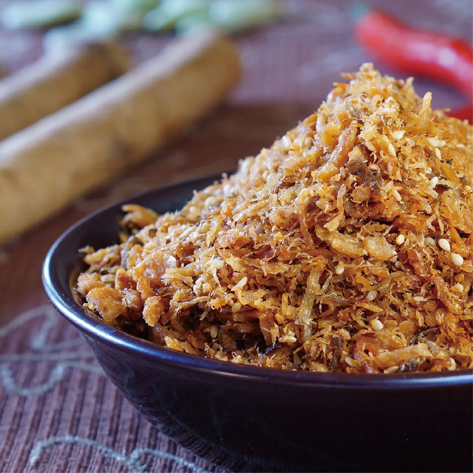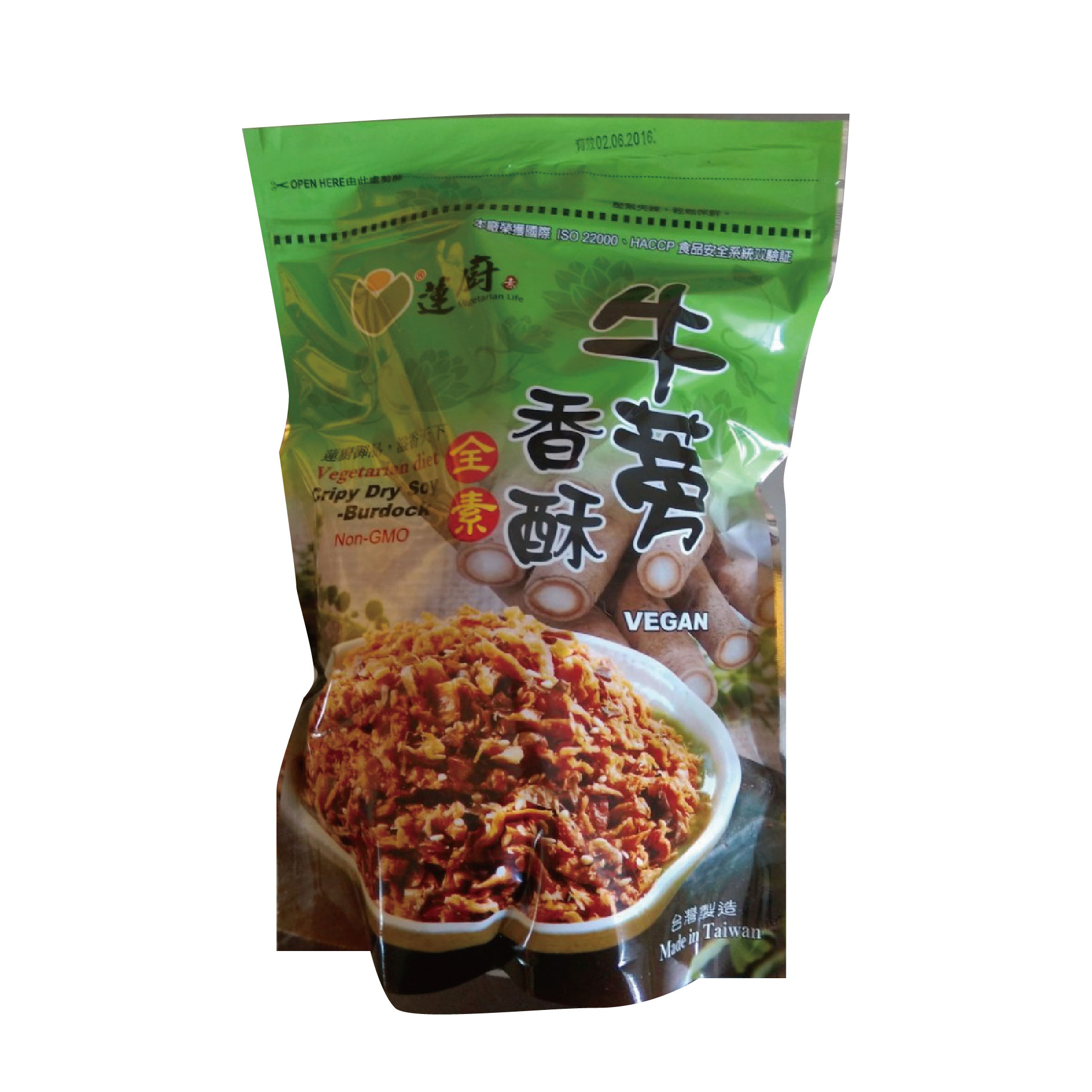 - 成分:非基因改造組織化植物蛋白(大豆分離蛋白、脫脂豆粉、玉米澱粉、小麥蛋白)、牛蒡、芝麻、豌豆粉、糖、醬油(水、黃豆、鹽、小麥)、棕櫚油、大豆油、芥花油、鹽、調味劑(5’-次黃嘌呤核苷磷酸二鈉、5’-鳥嘌呤核苷磷酸二鈉)、香料、抗氧化劑(混合濃縮生育醇)